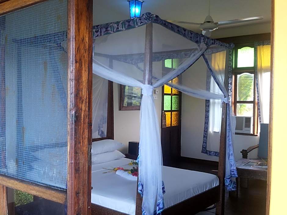 This bright, colorful room features a 4-poster bed with mosquito net, air conditioning and a private bathroom. There are views of the Indian Ocean from your balcony.